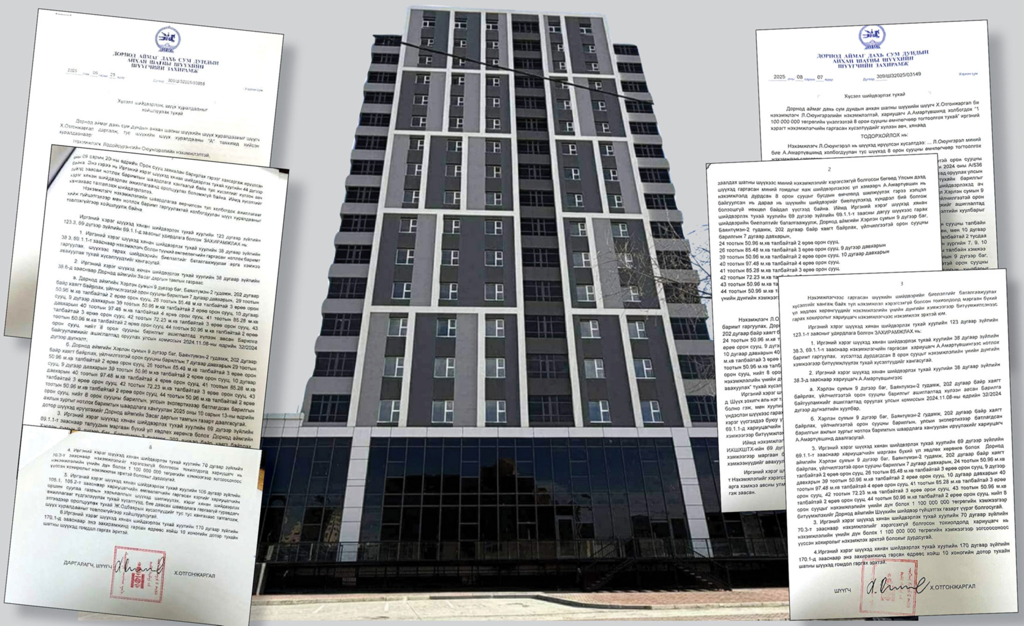 Гэтэл, орон сууц ашиглалтад орохоос өмнө А.Амартүвшин нь Дорнод аймаг дахь Улсын бүртгэлийн газраас “Дуусаагүй барилгын өмчлөх эрхийн гэрчилгээ”-г ганцхан өөрийнхөө нэр дээрээ гаргуулаад авчихжээ. Асуудал ингээд эхэлсэн байгаа юм. Мэдээж хэрэг, хожуу ч гэсэн үүнийг нь мэдсэн иргэн Л.Оюунгэрэл гэрээнийхээ үүргийг биелүүлэхийг А.Амартүвшингээс шаардсан. Харин тэрээр иргэн Л.Оюунгэрэлд өгөхөөр гэрээлсэн орон сууцнуудаа бусдад худалдчихсан байна. Гэрээнд заачихсан “…Долдугаар давхрын 51.21 мкв, 85.84 мкв, есдүгээр давхрын 51.21 мкв, 10 дугаар давхрын 51.21 мкв, 85.83 мкв, 97.87 мкв, 125.37 мкв талбай бүхий долоон орон сууцыг өгнө” гэсний нэг орон сууцыг нь хоёр хувааж жижигрүүлээд, уг 550 мкв талбайд хамрагдах найман орон сууцыг бусдад худалджээ. Тэрээр 2024 онд хотхоныхоо долдугаар давхрын 50.96 мкв орон сууцыг иргэн Д-д, 85.48 мкв орон сууцыг иргэн М-д, есдүгээр давхрын 50.96 мкв орон сууцыг иргэн О-д, 10 дугаар давхрын 97.48 мкь орон сууцыг иргэн Н-д, 85.28 мкв орон сууцыг иргэн У-д, 72.23 мкв орон сууцыг иргэн Х-д, 50.96 мкв орон сууцыг иргэн Г-д, мөн 50.96 мкв орон сууцыг иргэн М-д худалдчихсан баримт нь шүүхийн явцад ил болжээ. Ингээд иргэн Л.Оюунгэрэл ч, тэдгээр орон сууцыг худалдаж авсан иргэд ч хохирогч болчихсон байгаа юм.