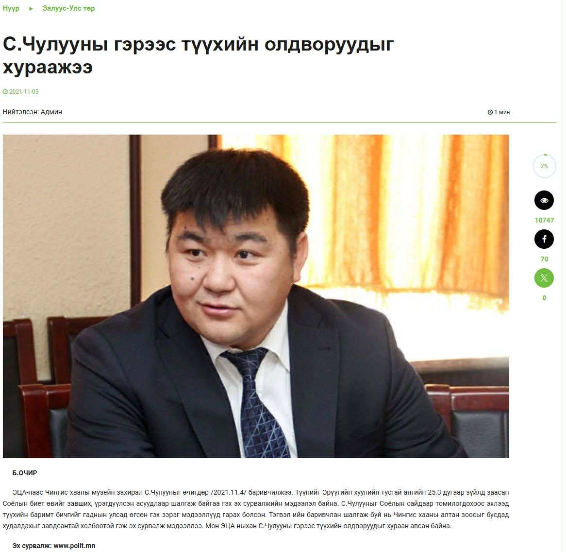 “Polit.mn” сайтад 2021 оны арваннэгдүгээр сарын 05-нд “С.Чулууны гэрээс түүхэн олдворуудыг хураажээ” гарчигтай мэдээ нийтэлсэн. Энэхүү мэдээллийн гарчиг болоод болоод агуулга илт худал болохыг манай сайтын редакц хүлээн зөвшөөрч, Чингис хааны музейн захирал, доктор С.Чулуунаас уучлалт хүсэж буйгаа үүгээр уламжилъя. "Polit.mn" сайт цаашид эх сурвалжаас мэдээлж буй мэдээллийг нягтлах, талуудын байр суурийг тэнцвэртэй нийтлэх гэсэн сэтгүүлзүйн зарчмаа баримтлан ажиллах болно.
