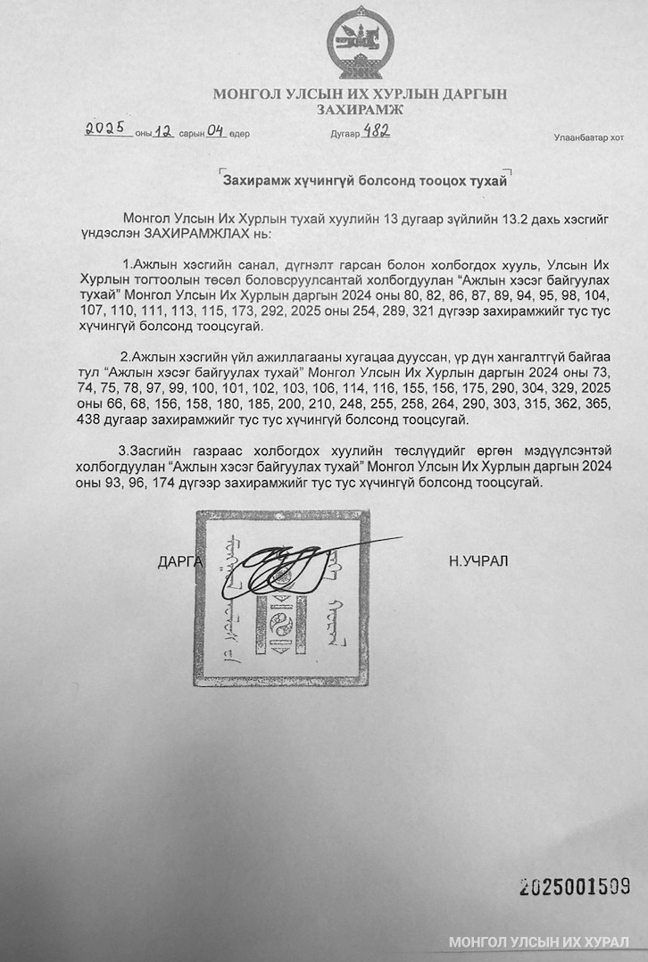 УИХ-ын чуулганы /12.04/ нэгдсэн хуралдааны үеэр УИХ-ын дарга Н.Учрал үг хэлэхдээ хууль, тогтоолын төсөл боловсруулах, холбогдох санал дүгнэлт гаргах үүрэг бүхий “Ажлын хэсэг байгуулах тухай” зарим захирамжийг хүчингүй болгож буйгаа мэдэгдлээ. Үүнтэй холбогдуулан тэрбээр, Монгол Улсын Их Хурлын даргын 2025 оны 12 дугаар сарын 04-ний өдрийн 482 тоот захирамжийг уншиж танилцуулсан юм. Уг захирамжид зааснаар ажлын хэсгийн санал, дүгнэлт гарсан болон холбогдох хууль, Улсын Их Хурлын тогтоолын төсөл боловсруулсантай холбогдуулан “Ажлын хэсэг байгуулах тухай” Монгол Улсын Их Хурлын даргын 2024 оны 80, 82, 86, 87, 89, 94, 95, 98, 104, 107, 110, 111, 113, 115, 173, 292, 2025 оны 254, 289, 321 дүгээр захирамжийг тус тус хүчингүй болгожээ. Тодруулбал, Эрчим хүчний салбарын шинэтгэлийн хүрээнд Эрчим хүчний тухай, Сэргээгдэх эрчим хүчний тухай, Эрчим хүч хэмнэлтийн тухай хууль болон холбогдох хууль тогтоомжийг шинэчлэн боловсруулах, Жижиг, дунд үйлдвэр, үйлчилгээг дэмжих тухай хуулийн хэрэгжилттэй танилцаж, бичил үйлдвэр, үйлчилгээ эрхлэгчдийг дэмжих тогтолцоог оновчтой болгох чиглэлээр санал, дүгнэлт гаргах, холбогдох хуулийн төсөл боловсруулах, Төр хувийн хэвшилтэй өрсөлдөхгүй байх зарчмын хүрээнд холбогдох эрх зүйн орчныг боловсронгуй болгох талаар судлах, санал, дүгнэлт гаргах, шаардлагатай бол хуулийн төсөл боловсруулах, Ялгаварлан гадуурхалтын эсрэг авах арга хэмжээний талаар судалгаа хийж санал, дүгнэлт гаргах, шаардлагатай бол хуулийн төсөл боловсруулах, Тамхины хяналтын тухай хуулийн хэрэгжилттэй танилцаж, электрон тамхи, түүнтэй холбоотой асуудлаар холбогдох хуульд нэмэлт, өөрчлөлт оруулах шаардлагатай эсэхийг судлан, санал, дүгнэлт гаргах, шаардлагатай бол холбогдох хуулийн төсөл боловсруулах үүрэг бүхий ажлын хэсгүүд багтжээ.