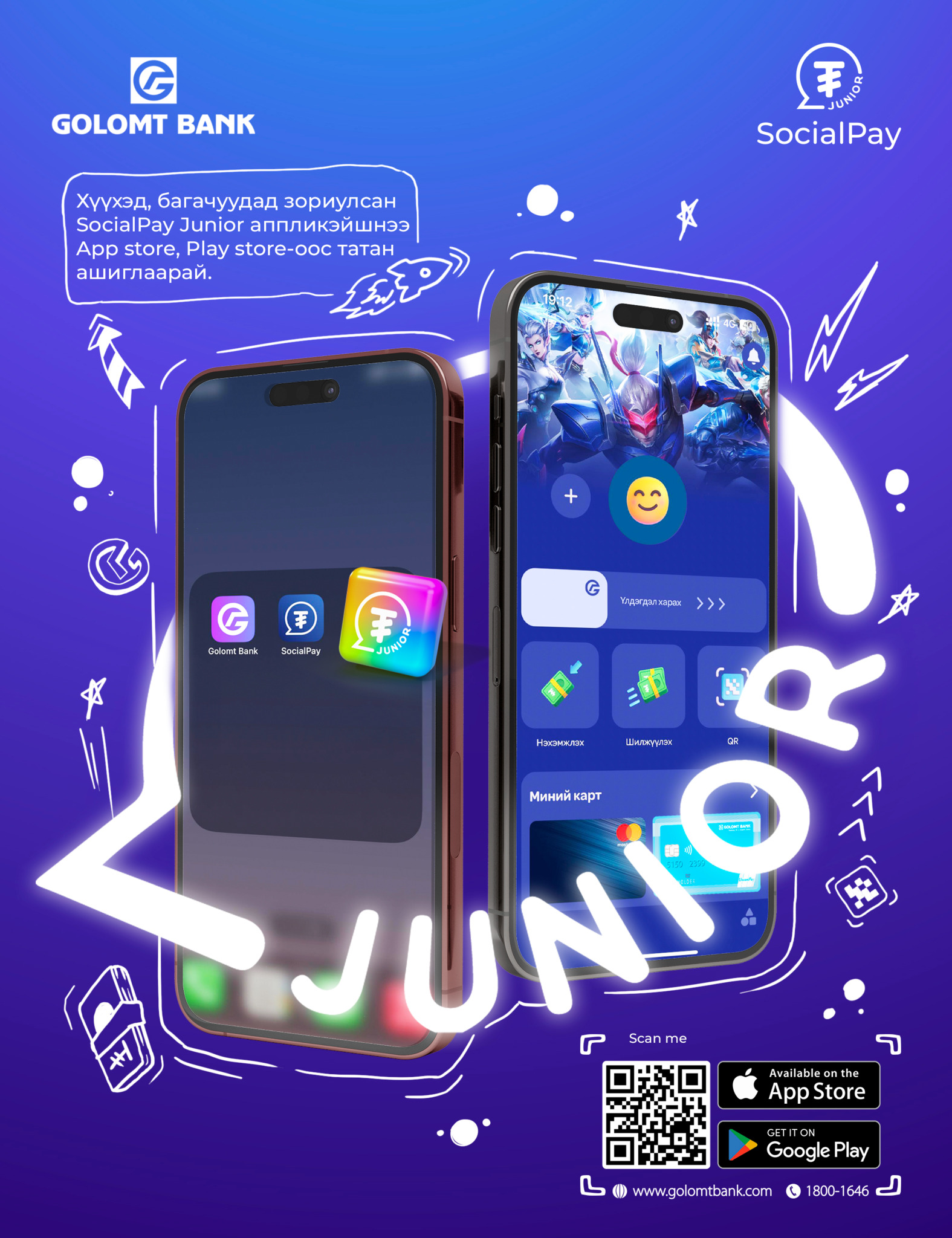 SocialPay Junior аппликэйшн нь 8-18 насны хүүхэд, залуучуудад зориулж тусгайлан  бүтээсэн төлбөр тооцоо, шилжүүлэг, нэхэмжлэл, виртуал карт, дата нэгж, тоглоом, тасалбар, дэлгүүр болон олон төрлийн хөнгөлөлт урамшуулыг багтаасан хамгийн шилдэг сүпер аппликэйшн юм. Уг аппликэйшныг хүүхэд, залуус гар утсандаа татаж суулгаад, онлайнаар харилцагч болоход нээлттэй бөгөөд олон төрлийн бэлэг, урамшуулалд шууд хамрагдах боломжтой.