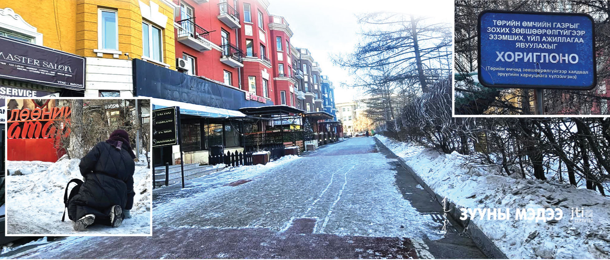 Хүйтний эрч чангарч ес эхэлсэн энэ өдрүүдэд хотын гудамж халтиргаа, гулгаа ихтэй явган зорчигчдод халтай байна. Албан байгууллагууд 50 метрээс дотогш оногдсон цасаа цэвэрлэх нь цэвэрлэж, зарим нь огт цэвэрлээгүй дүр зураг хаа сайгүй. Улаанбаатар хотын төвд орших олон зуун гадаад, дотоодын иргэд зорчдог "Өглөөний гудамж" коток шиг мөстжээ. Төрийн өмчийн нийтийн эзэмшлийн газар гэсэн хөх бичигтэй пайз харагдавч энд эзэн алга. Пайз дээр “Төрийн өмчийг эвдэж сүйтгэсэн этгээдэд хуулийн хариуцлага тооцно” гэсэн сануулга, сэрэмжлүүлэгтэй. Гэвч хүнд ээлтэй хот гэж лоозогнодог хэр нь энд хүн унаж гэмтэж хохирвол хэрхэх тухай нэг ч үг, үсэг алга.