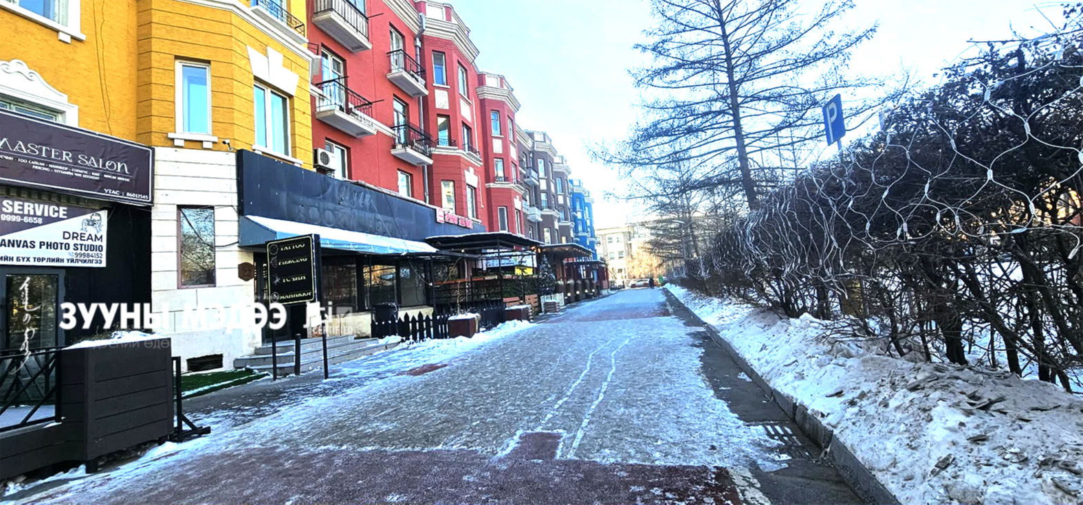 Тус гудамжны орон сууцны нэг давхар тэр чигтээ үйлчилгээний газрууд байрладаг. Тэдний зарим нь 50 метр дэх цас, мөсөө цэвэрлэсэн байхад зарим нь огт цэвэрлээгүй ийм л дүр төрхтэй байна.