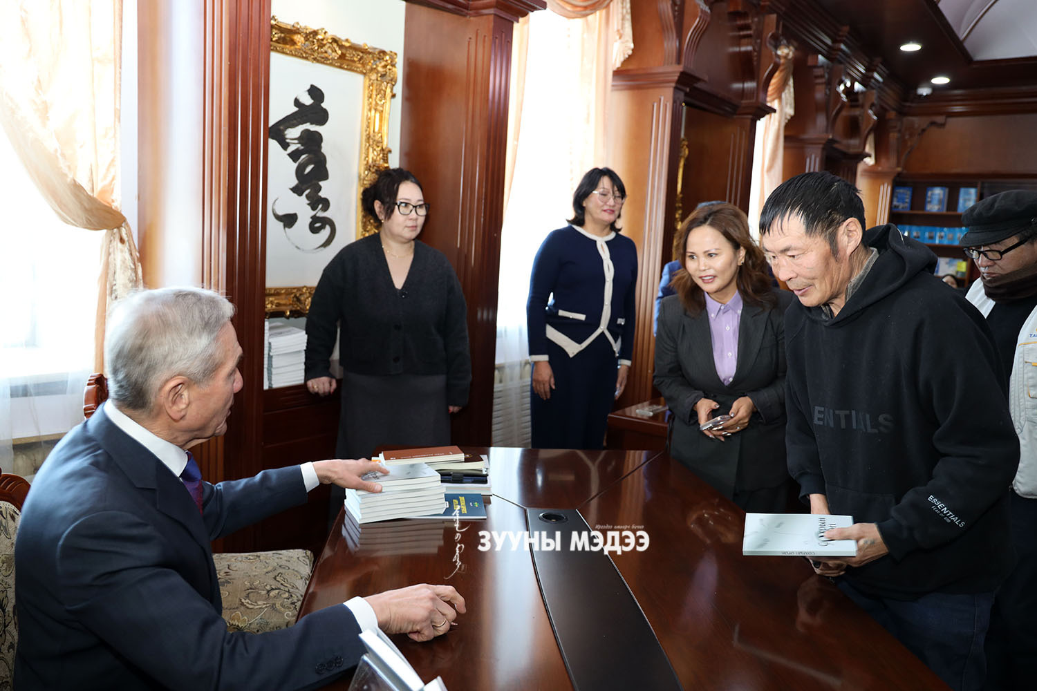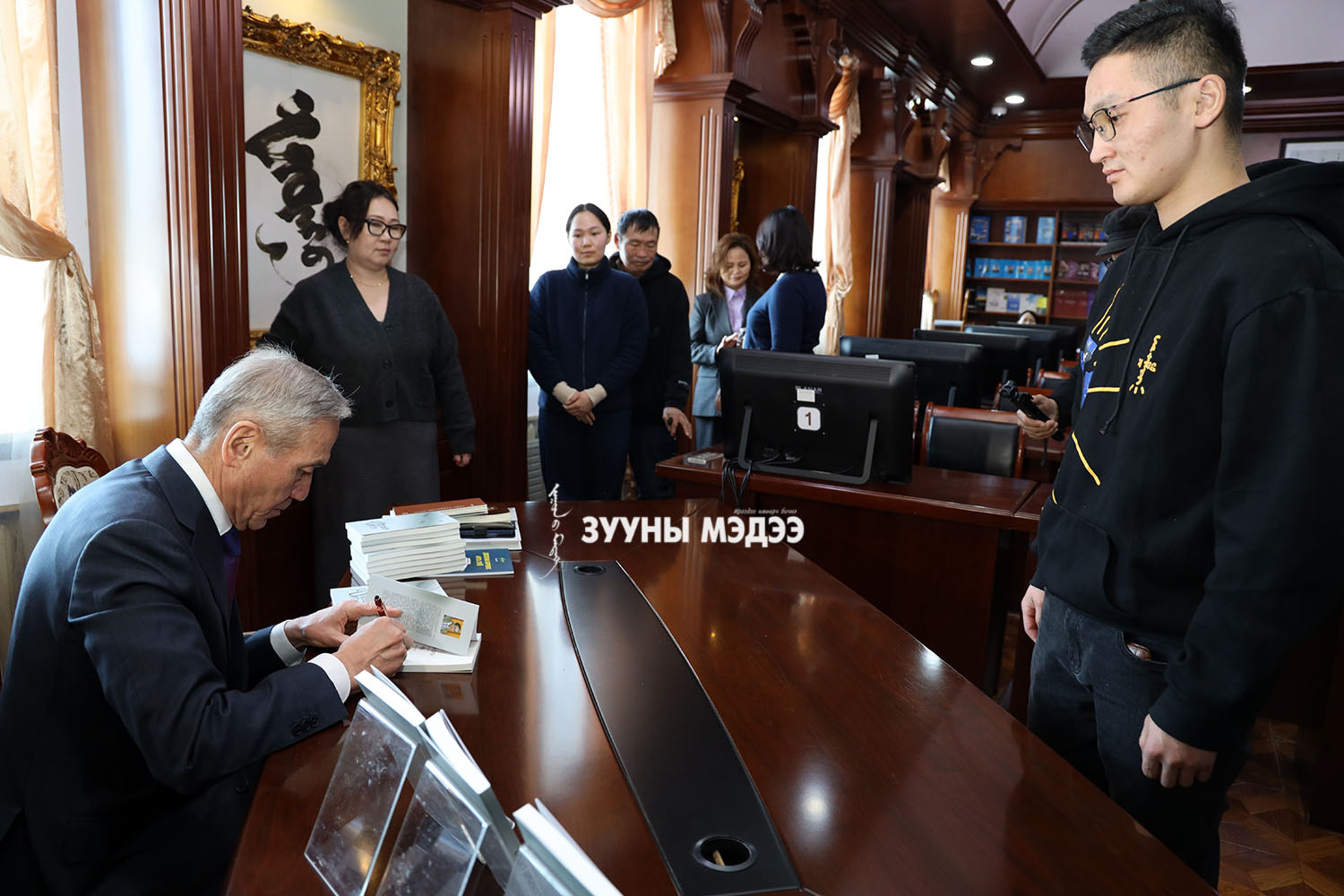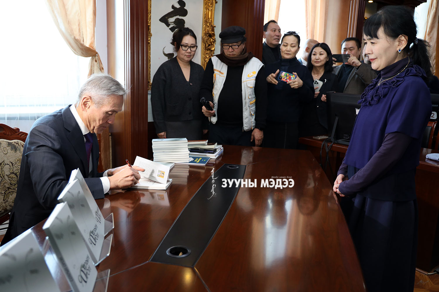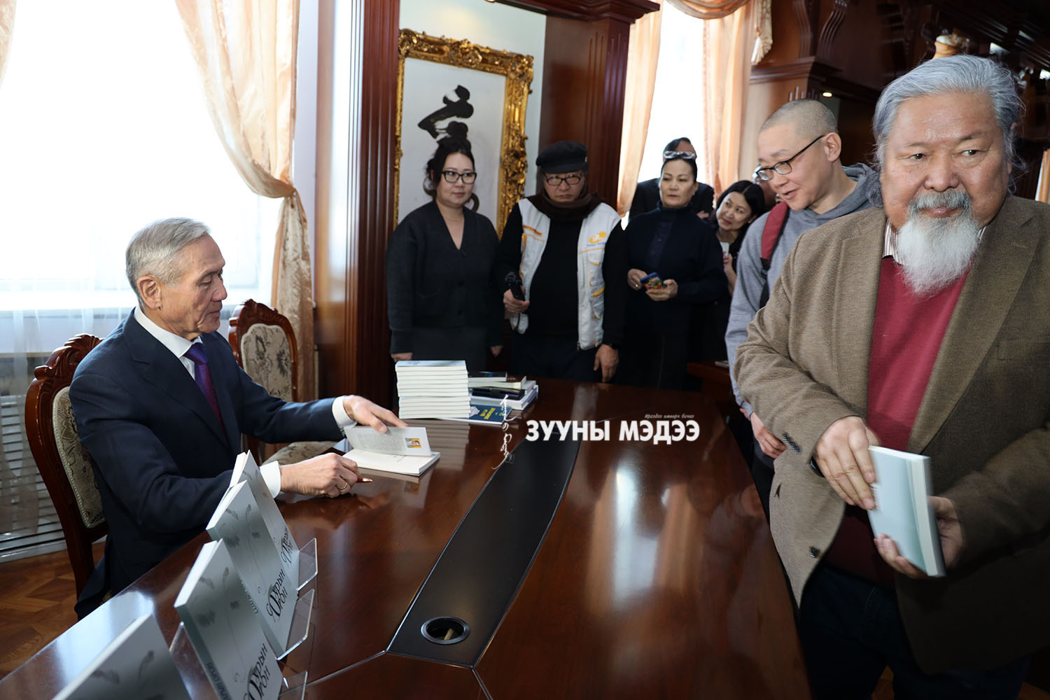 Номын нээлтийн дараа ирсэн зочиддоо гарын үсэгтэй номоо бэлэглэлээ.