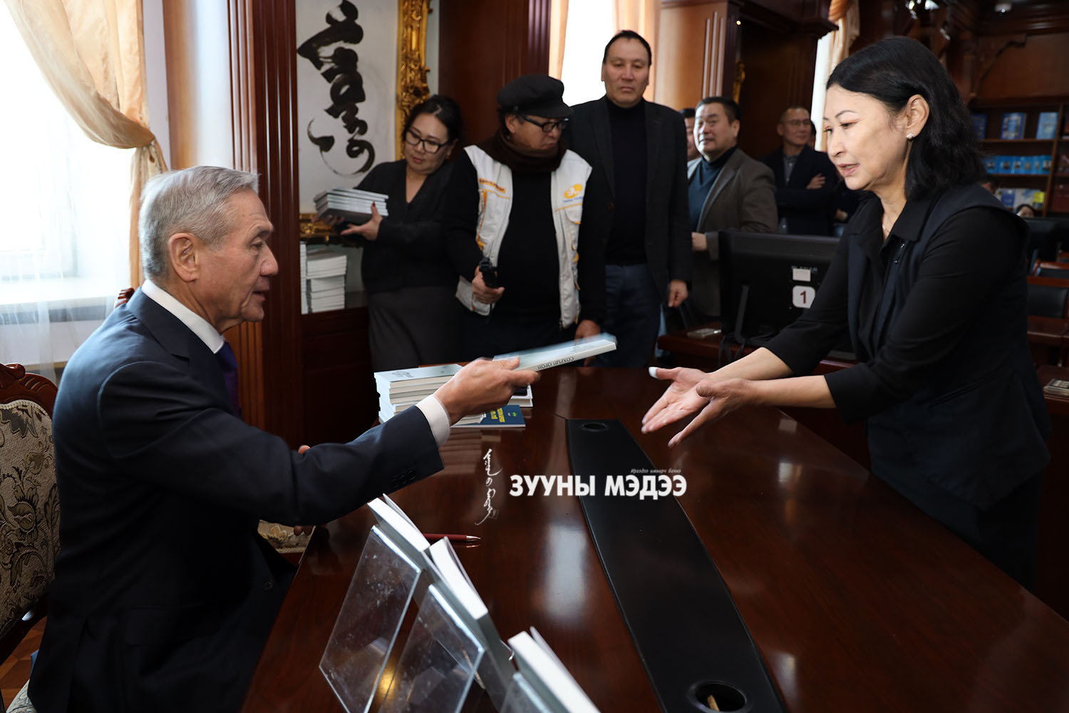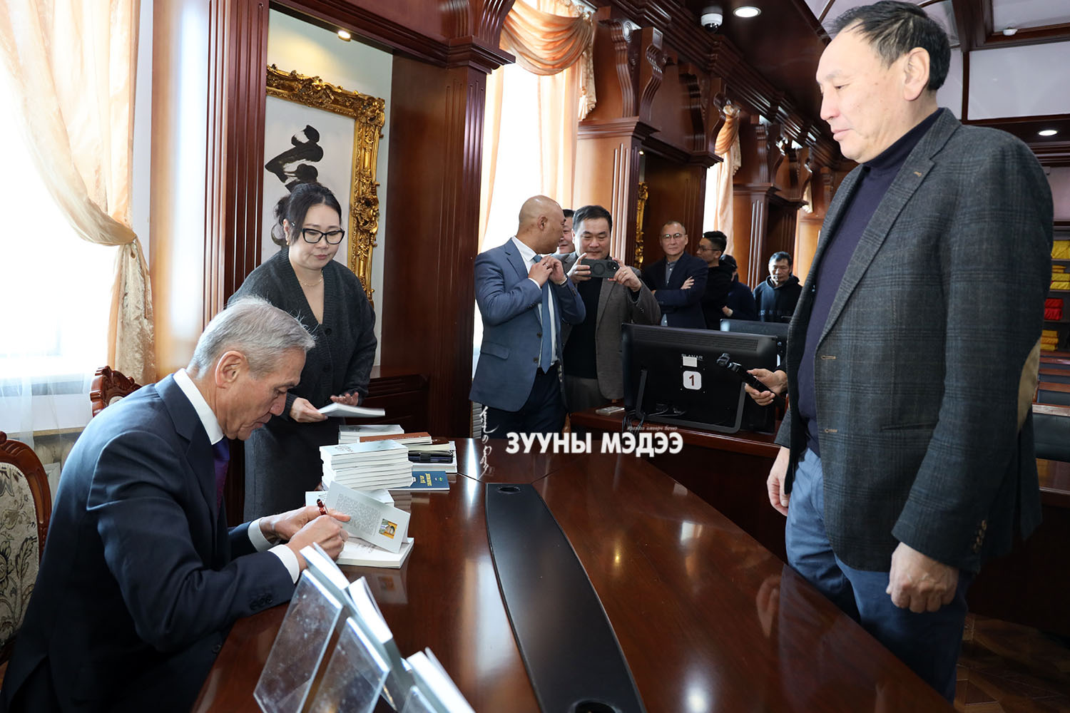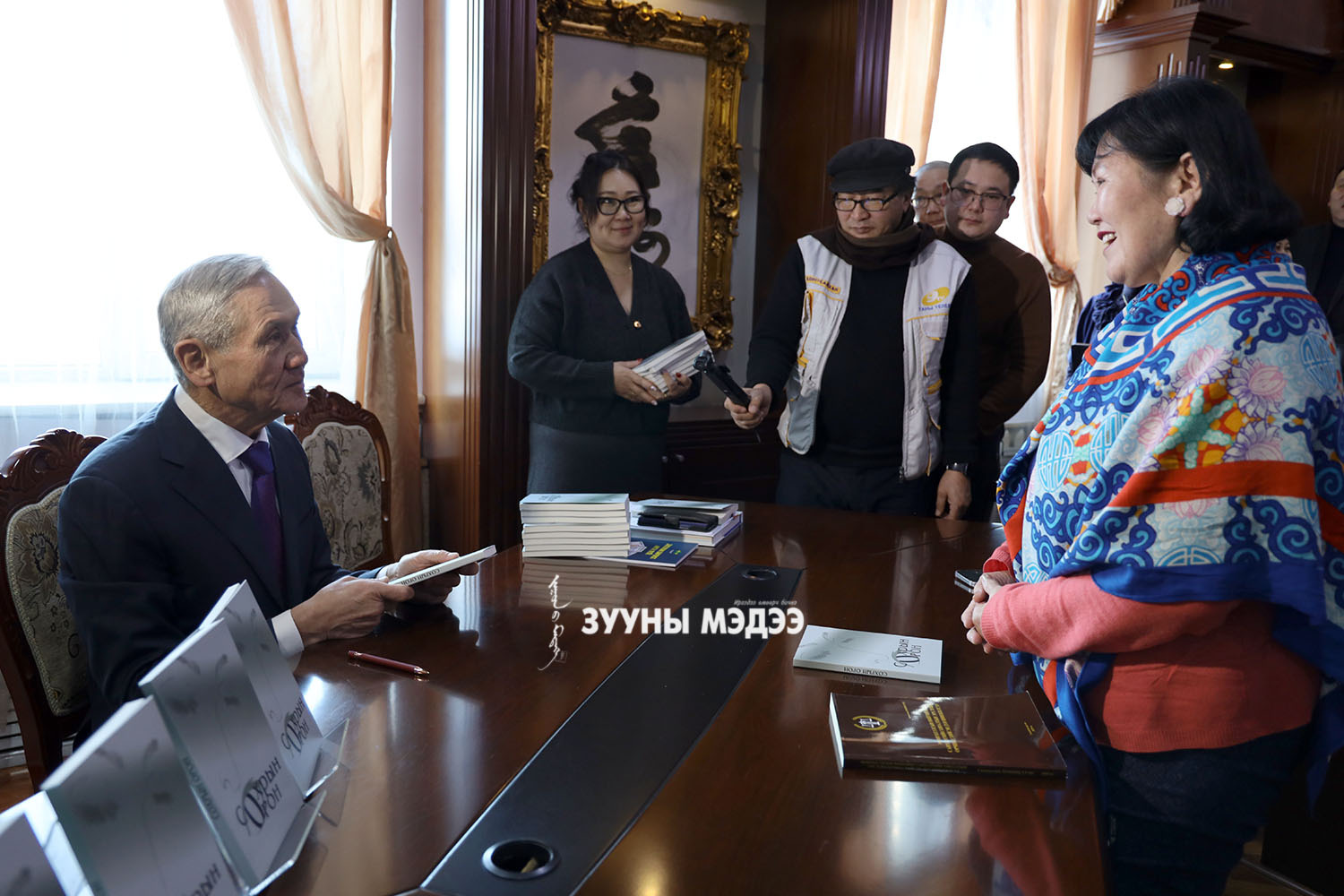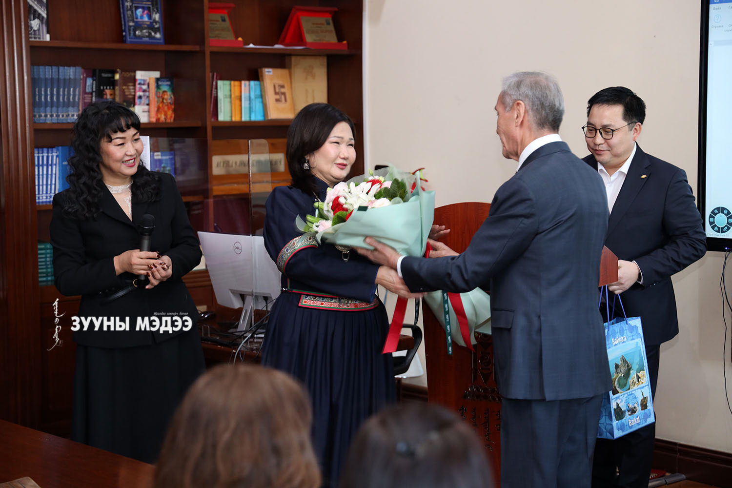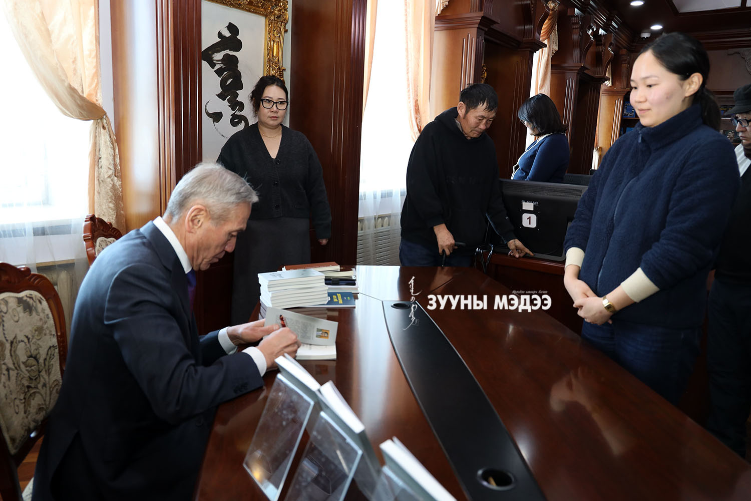 Номын нээлтийн дараа ирсэн зочиддоо гарын үсэгтэй номоо бэлэглэлээ.