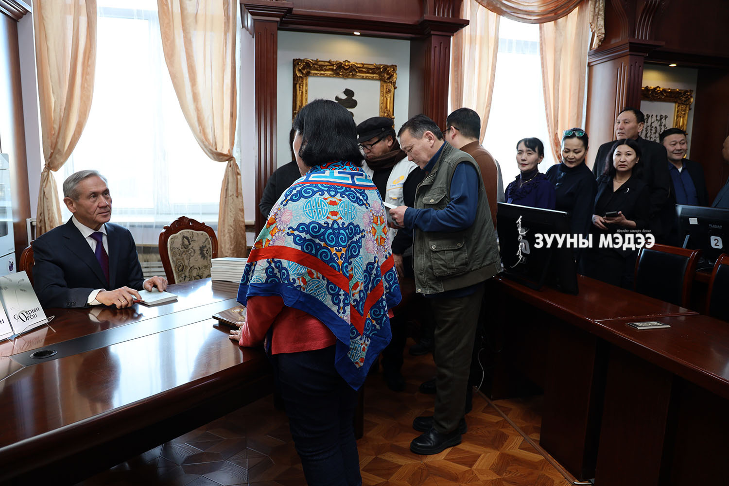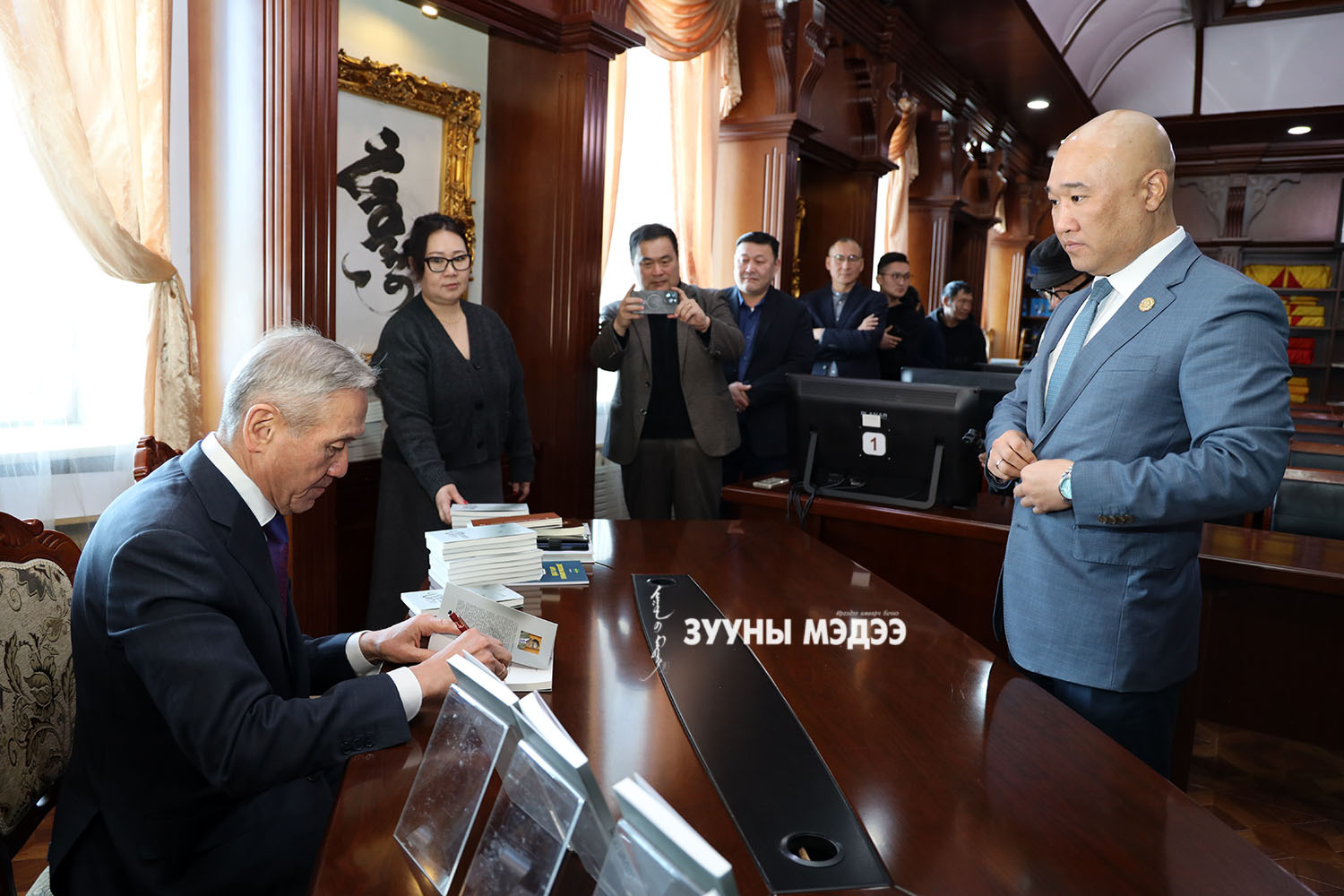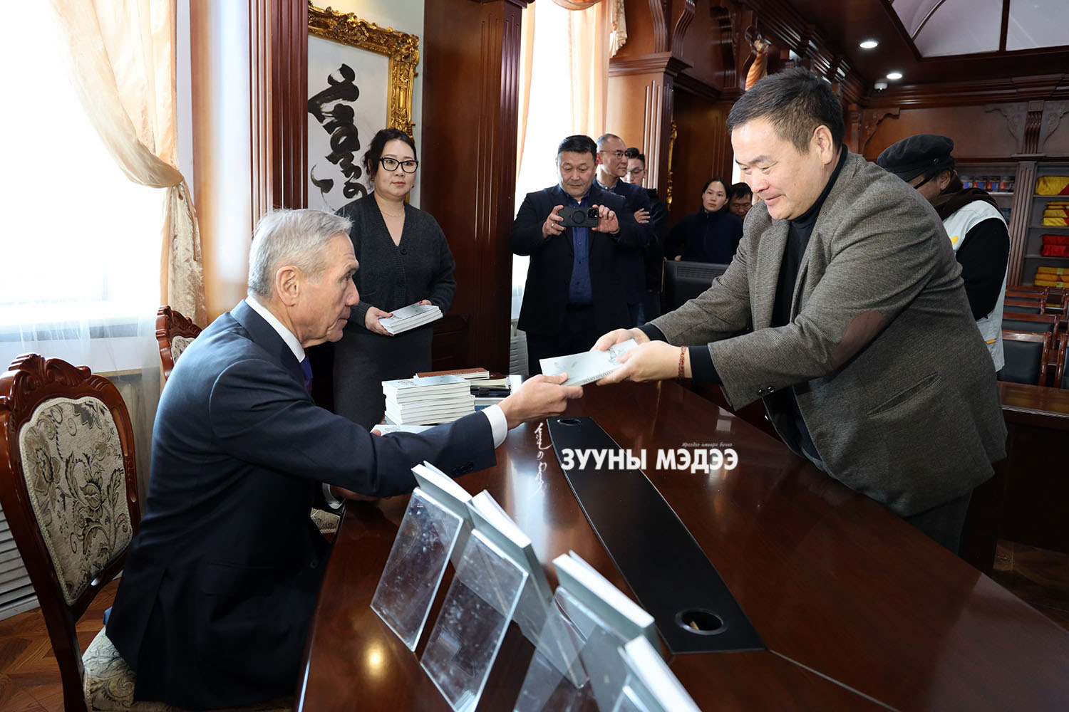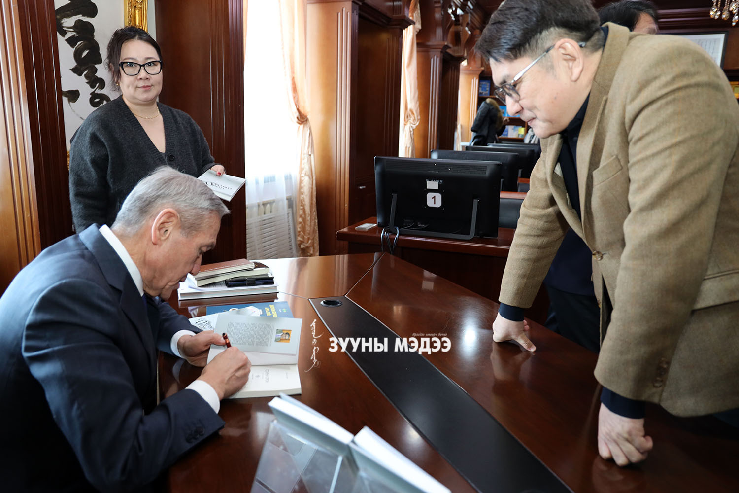 Номын нээлтийн дараа ирсэн зочиддоо гарын үсэгтэй номоо бэлэглэлээ.