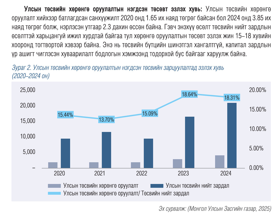 Улсын төсвийн хөрөнгө оруулалт нь Засгийн газрын зүгээс дэд бүтцийн төслүүдийг хэрэгжүүлэх, шаардлагатай тоног төхөөрөмж худалдан авах зэрэг замаар эдийн засгийг идэвхжүүлэх, иргэдийн амьдралын чанарыг сайжруулах, төрийн үйлчилгээний хүртээмжийг нэмэгдүүлэх бодлогын чухал хэрэгсэл юм. Төсвийн хөрөнгө оруулалтын үр ашгийг зөвхөн тоон гүйцэтгэлээр бус, эдийн засаг, нийгмийн бодит нөлөөллөөр хэмжих шаардлага улам бүр нэмэгдэж байгааг судалгааны байгууллага онцолж байна. Хөрөнгө оруулалтын бодит үр өгөөжийг дээшлүүлэхийн тулд төсөл сонголт, төлөвлөлтийн ил тод байдал, гүйцэтгэлийн хяналт, бодлогын уялдаа холбоог сайжруулах, нэгдсэн хяналт-шинжилгээ, үнэлгээний тогтолцоог бэхжүүлэх шаардлагатай зэрэг олон асуудлыг судалгааны багийн зүгээс зөвлөж байна.