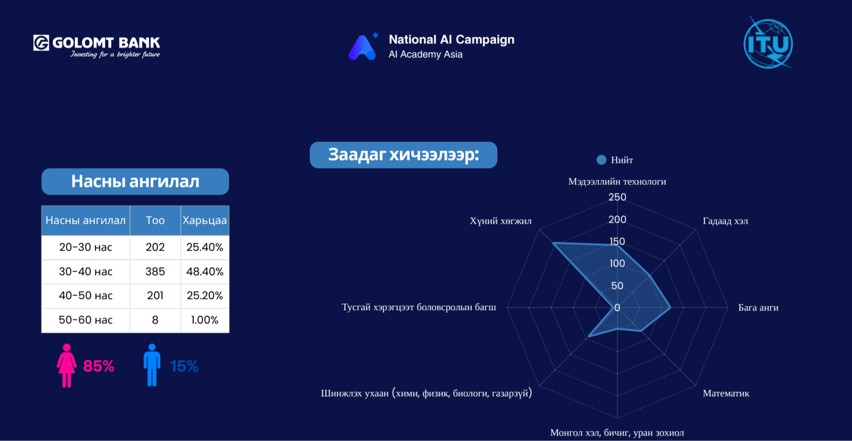 2025 онд аяны хүрээнд ерөнхий боловсролын сургуулийн 450 багш, 50 инженерийг хиймэл оюуны мэдлэг, хэрэглээнд чадавхжуулсан байна. Энэ жилийн тухайд Голомт банкны дэмжлэгтэйгээр Олон улсын цахилгаан холбооны байгууллагын “AI Skills Coalition”-ны хүрээнд Монгол Улсын 21 аймаг, нийслэлийн есөн дүүргийн ерөнхий боловсролын сургуулийн 500 багшийг хамруулж эхэлээд байгаа ажээ. Энэ оны хоёрдугаар сарын 28-ний өдөр “Хиймэл оюуны 500 багш бэлтгэх хөтөлбөр”-ийн нээлтийн үйл ажиллагаа цахимаар болсон байна. Энэ үеэр хөтөлбөрт шалгарсан 500 багш гурван сарын хугацаанд хиймэл оюуны сургалтад хамрагдаж улмаар сум, орон нутгийн сурагчдад заах юм байна. Энэ жилийн сонгон шалгаруулалтад нийт 3998 багш нар материалаа илгээсэн байна.