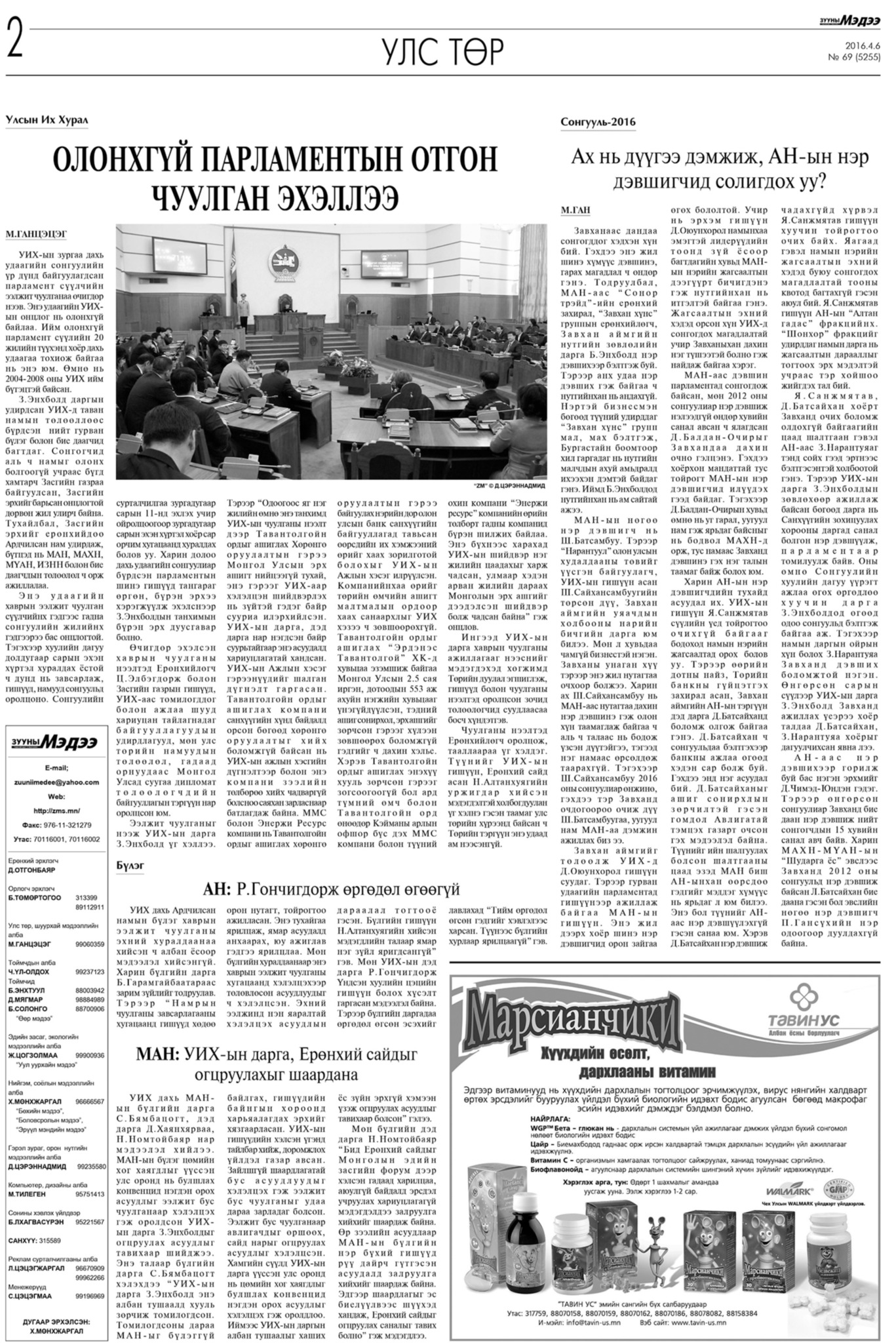 “Олонхгүй парламентын отгон чуулган эхэллээ” нийтлэлийг манай сонины Улс төрийн албаны сэтгүүлч М.Ганцэцэг бичиж байжээ. 2012-2016 он бол сүүлийн 35 жилд хоёр удаа тохиосон олонхигүй парламентын он жилүүд байлаа. Аль нэг нам нь олонх бололгүй, хамтарсан Засгийн газар байгуулагдаж, Засгийн эрх ерөнхийдөө Ардчилсан намд төвлөрч байсныг санаж байна. Гэхдээ Гүйцэтгэх засаглалын бүтцэд МАН, МАХН, МҮАН, ИЗНН болон бие даагчдын төлөөлөл ажилласан юм. Харин 2016 он сонгуулийн жил байв. Тэр утгаараа хаврын чуулган сонгуулийн өнгө аясыг тодорхойлохуйц, багагүй хүлээлттэй байсан байж таарна. 2016 оны дөрөвдүгээр сарын 5-ны өдөр бол Их хурлын хаврын чуулганы нээлтэд ерөнхийлөгч асан Ц.Элбэгдорж оролцсон ч байр сууриа илэрхийлж үг хэлээгүй байна. Харин Их хурлын дарга асан З.Энхболд чуулганы нээлтийн үеэр Тавантолгойн асуудлыг тодотгож, ач холбогдол өгч байсныг түүний хэлсэн үгнээс харагдаж байна. Тэрээр “Одоогоос яг нэг жилийн өмнө энэ танхимд УИХ-ын чуулганы нээлт дээр Тавантолгойн ордыг ашиглах хөрөнгө оруулалтын гэрээ Монгол Улсын эрх ашигт нийцээгүй тухай, энэ гэрээг УИХ-аар хэлэлцэн шийдвэрлэх нь зүйтэй гэдэг байр сууриа илэрхийлсэн”. “…Тавантолгойн ордыг ашиглах “Эрдэнэс Тавантолгой” компанид хувьцаа эзэмшиж байгаа Монгол Улсын 2,5 сая иргэн, дотоодын 553 аж ахуйн нэгжийн хувьцааг үнэгүйдүүлсэн, тэдний ашиг сонирхол, эрх ашгийг зөрчсөн гэрээг хүлээн зөвшөөрөх боломжгүй гэдгийг ч дахин хэлье. Хэрэв Тавантолгойн ордыг ашиглах энэхүү хууль зөрчсөн гэрээг зогсоогоогүй бол ард түмний өмч болон Тавантолгойн орд өнөөдөр гадны компанид бүрэн шилжих байлаа. Энэ бүхнээс харахад УИХ-ын шийдвэр нэг жилийн цаадахыг харж чадсан, улмаар хэдэн арван жилийн дараах Монголын эрх ашгийг дээдэлсэн шийдвэр байж чадсан” гэжээ.
