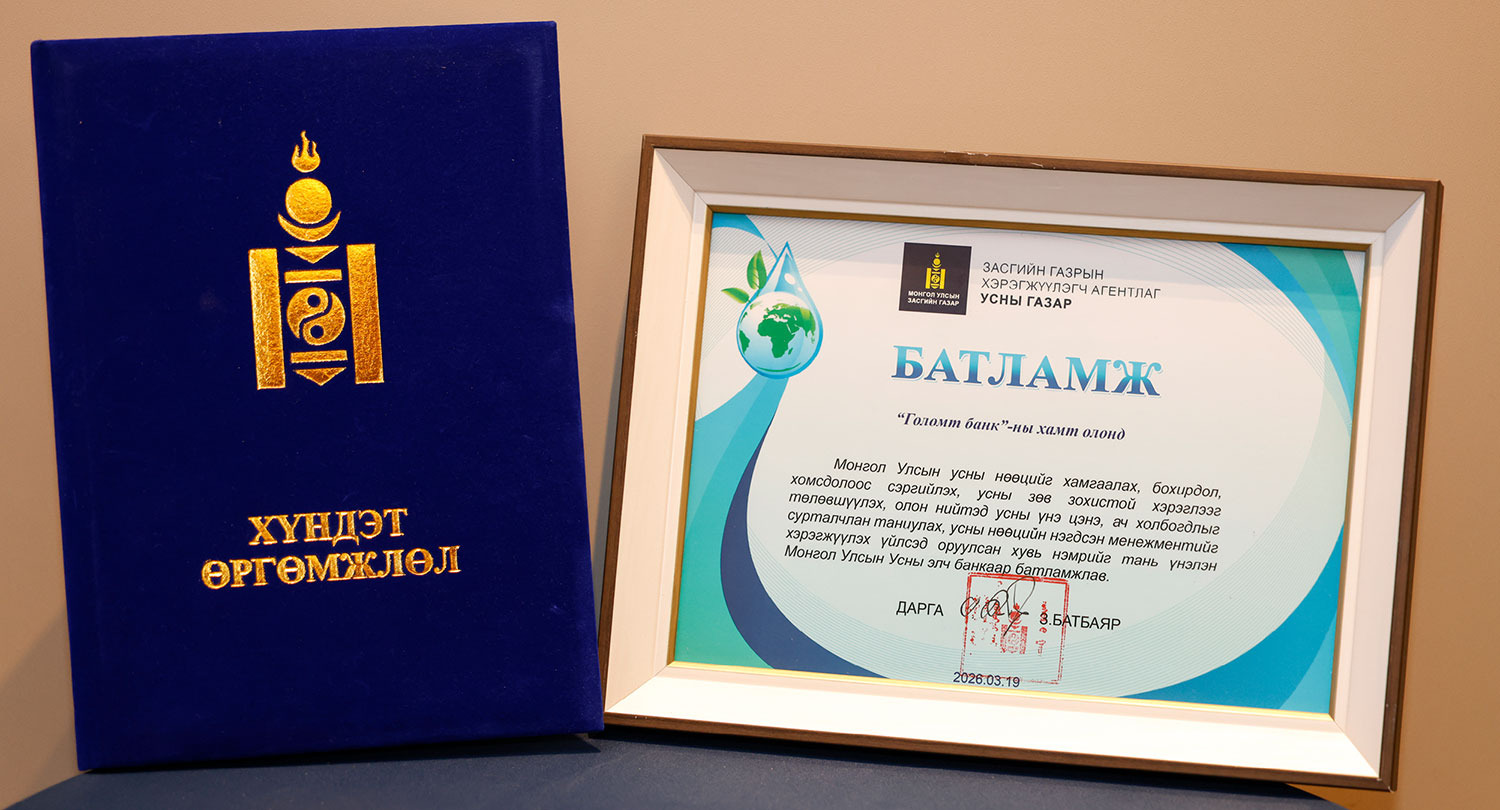 Дэлхийн усны өдрийг тохиолдуулан “Ус ба тэгш эрх” сэдвээр зохион байгуулагдсан арга хэмжээний үеэр Монгол Улсын усны нөөцийг судалж тогтоох, зүй зохистой ашиглах, хамгаалах, нөхөн сэргээх ажилд оруулж буй хувь нэмрийг үнэлж Голомт банкийг “Усны элч” банкаар дахин өргөмжиллөө.
