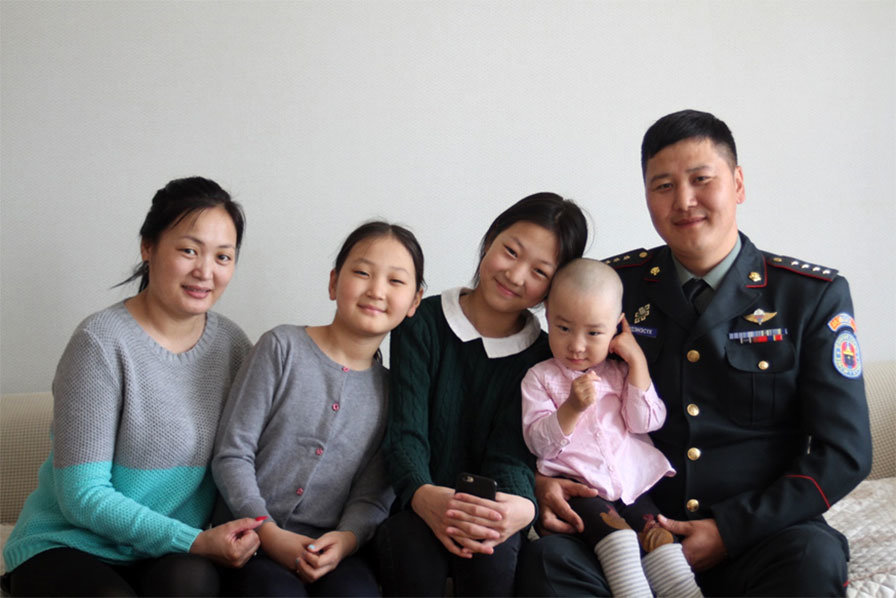 Бидний эхний онцлох айл тус командлалын Материал техникийн хэлтсийн материал хангалтын офицер, ахмад Г.Эрдэнэсүхийнх. Зэвсэгт хүчинд 11 дэх жилдээ алба хааж байгаа энэ залуу Сүхбаатар аймгийн Мөнххаан сумынх, гэргий Э.Аззаяа нь мөн л Сүхбаатар аймгийн Уулбаян сумынх гэнэ. Тэд арван жилийн нэг ангийнхан бөгөөд гэр бүл болоод 14 жил болж байгаа, гурван хөөрхөн охины аав, ээж ажээ. Гэрийн эзэн БХИС-ийг 2006-2010 онд санхүүгийн удирдлага, 2011 онд ар талын офицер мэргэжлээр тус тус төгсөж, ажлын гараагаа Зэвсэгт хүчний 327 дугаар ангиас эхлүүлсэн байна. Үүний дараа 2012-2016 онд Зэвсэгт хүчний 016 дугаар бригадад шатахууны нөөцийн агуулахын дарга, 2016-2019 онд Зэвсэгт хүчний 084 дүгээр ангид хангалтын офицер, 2019 оноос Хуурай замын цэргийн командлалд материал хангалтын офицероор томилогдсон нь энэ. Түүний олон улсын болон хамтарсан сургалт, дадлагад ч оролцсон олон байна. Тухайлбал, БНТУ-д зохион байгуулагдсан тусгай хүчнүүдийн хамтарсан тактикийн хээрийн сургуулиас эхлээд “Хааны эрэлд”, “Сэлэнгэ”, “Бланс мажик”, “Нүүдэлчин заан”, “Аравт” гээд олон улсын болон хамтарсан сургалт, дадлагуудад нэгээс дөрвөн удаа хүртэл оролцож, туршлага хуримтлуулжээ. Түүнийг онцлох өөр нь нэг зүйл нь 2015 онд Аугаа их Эх орны дайны ялалтын 70 жилийн ойгоор ОХУ-ын Москва хотын төв талбайд монгол цэргийн цог жавхаа, сүр хүчийг илтгэж цэргийн ёслолын жагсаалаар алхсан 70 дайчдын нэг. Энэ тухай тэрээр “Эх орноо төлөөлж байна гэхээр өөрийн эрхгүй бахархал, омогшил төрдөг юм билээ. Тэр үедээ бэлтгэл, сургалтаар “нүдүүлж” байсан ч одоо эргээд бодоход дурсамж ихтэй сайхан байдаг юм. Тэгэхэд манай Мөнххаан сумынхан тэр чигтээ зурагтаар үзсэн гэнэ лээ. “Манай нутгийн хүү энэ дунд яваа” гээд л. Аав, ээжид минь баяр хүргээд л. Их сайхан байсан шүү” гэлээ. “Цэрэг хүний аав, ээж өөрийн эрхгүй л Зэвсэгт хүчний хугацаагүй байлдагч болсон байдаг шүү” хэмээхэд “Тийм юм билээ. Миний аавыг Ш.Ганболд гэдэг насаараа л тракторын жолоо барьсан сайхан буурал бий. Залуу байхаасаа л нутаг орондоо хурданы морь сойж, уралдуулж яваа сумын алдарт уяач хүн дээ. Миний ах нар болоод би гэдэг нөхөр наадам болгоноор аавынхаа уясан морийг унаад дарцаглаж давхиж явснаа эргээд бодоход их сайхан шүү. Олон ч морийг түрүүлж, айрагдуулж аавыгаа баярлуулж явлаа. Ээжийг минь Д.Оюун гэдэг Мөнххаан сумандаа 33 жилдээ сувилагчаар ажиллаж байгаа. Би эхээс дөрвүүлээ. Хамгийн том нь Г.Болорсүх Хэнтий аймгийн Цагдаагийн газарт, дараах нь Г.Болор-Эрдэнэ хувиараа хөдөлмөр эрхэлдэг бол бага дүү Г.Мөнх-Эрдэнэ Зэвсэгт хүчний 065 дугаар ангийн дугаар салбарт орлогчоор ажилладаг” гэв. Энэ зуур түүний бага охин нөгөө өрөөнөөс “Аав аа!” гэсээр гүйж ирэв. Хөөрхөн халзан толгойтой болчихож. Зургаадугаар сарын 5-ны өдрийн билэгт сайн өдөр даахийг нь үргээлгэсэн гэнэ. Энэ үеэр хоёр талын аав, ээж нь ирээд “Арми зүтгэсэн нэгэндээ ийм л өгөөжтэй газар даа. Миний хүү ажлаа л сайн хий. Одоо үр хүүхэддээ санаа зовох юмгүй боллоо” гээд л өмнөөс нь талархаж, сүйд болсныг гэрийн эзэн маань баяртайгаар ярилаа.